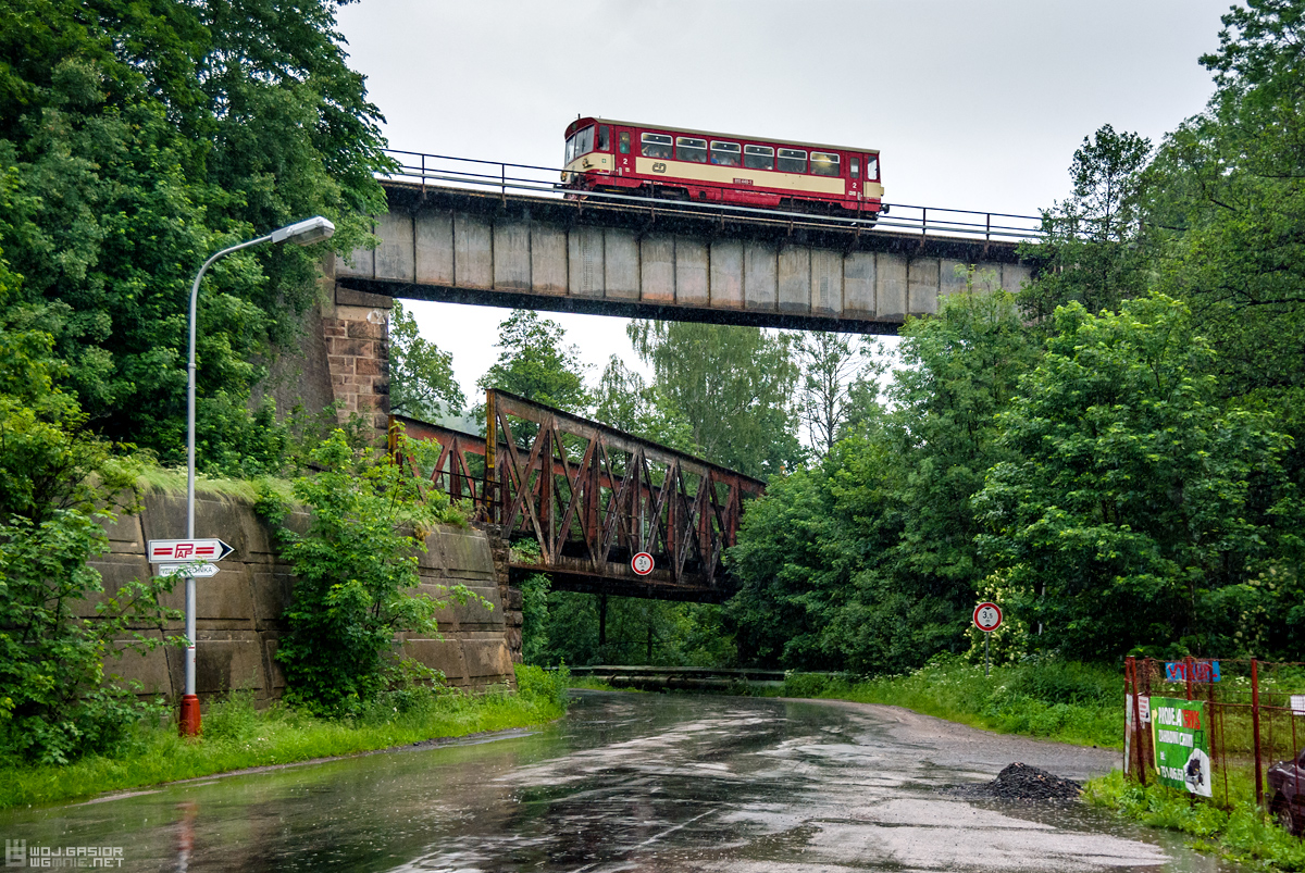 810 448-1 jako poc. 15414 rel. Jaroměř – Trutnov hl.n. w strugach ulewnego deszczu mija wiadukt nad linią kolejową do Teplic nad Metují w Trutnově Poříčí. Kurs ten planowo jest obsługiwany wagonem motorowym serii 854. Krótki motorak chyba jednak lepiej pasuje do tego kadru. 2012-06-10