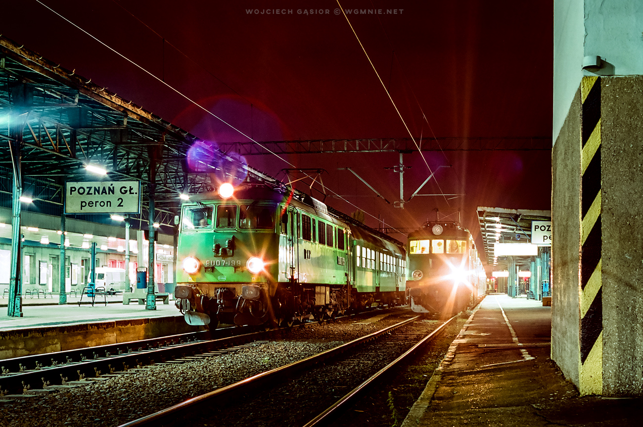 EU07-199 z pociągiem osobowym 331 do Zielonej Góry i EU07-349 z pociągiem osobowym 520 do Ostrowa Wlkp. przed odjazdem z Poznania Głównego. [15.09.2004]
