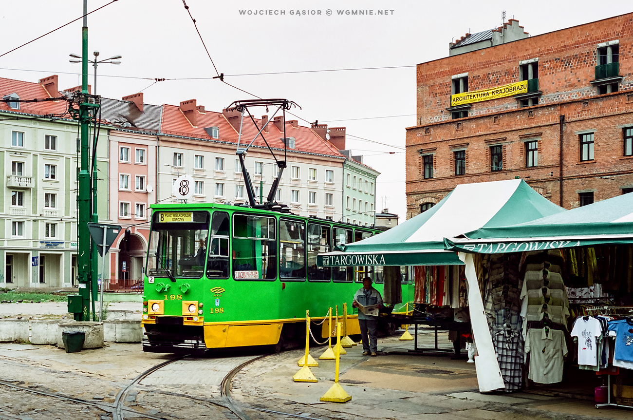 Poznań, pl. Wielkopolski, 105Na+105NaD 198+197. Urzekł mnie ten banner na niedokończonej nadbudówce, będącej z pewnością perłą architektury i korzystnego wpływu na miejski krajobraz. [19.07.2005]