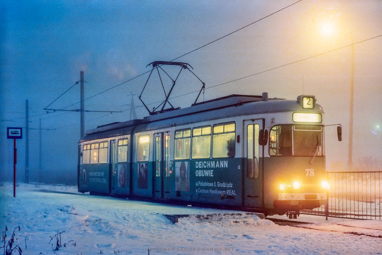 Grudziądz, pętla Rządz, GT6ZR 78. Tytułowy wagon w swoim życiu zwiedził cztery sieci tramwajowe: Hagen (1962-1975), Würzburg (1975-2000), Grudziądz (2000-2010) i Łódź (do 2015). 05.02.2003