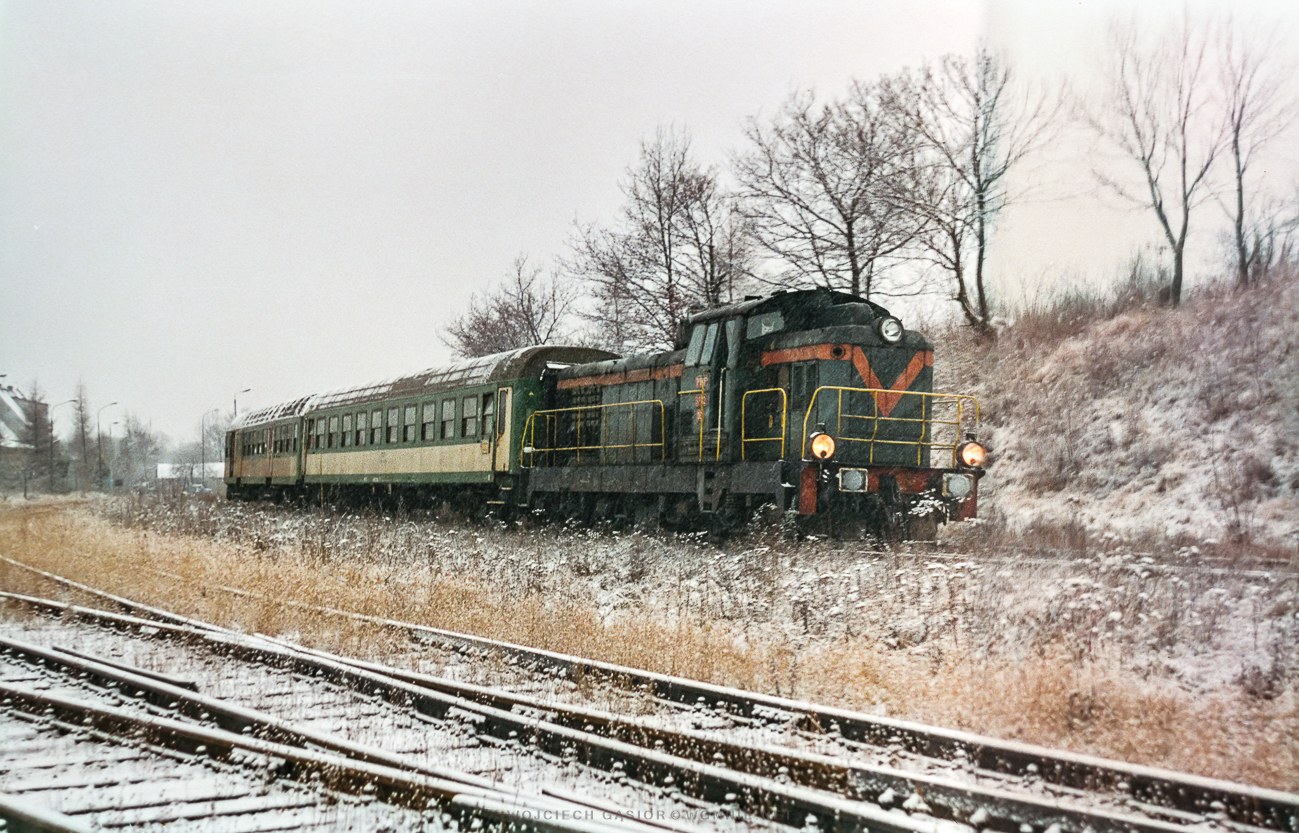 SP42-001 z pociągiem osobowym 7725 relacji Lubawka – Jelenia Góra (łącznicą Krużyn – Marciszów Górny) wyjeżdża z Kamiennej Góry. Tytuł zdjęcia stanowi treść dumnej uwagi, jaką umieściłem na odwrocie odbitki. 😉 Dodam jeszcze, że foto na prawo od lokomotywy było mocno prześwietlone w wyniku niedoskonałości zenitowej migawki. Być może maskę podczas obróbki można było nałożyć precyzyjniej, ale z tego się nie strzela. 30.12.2000