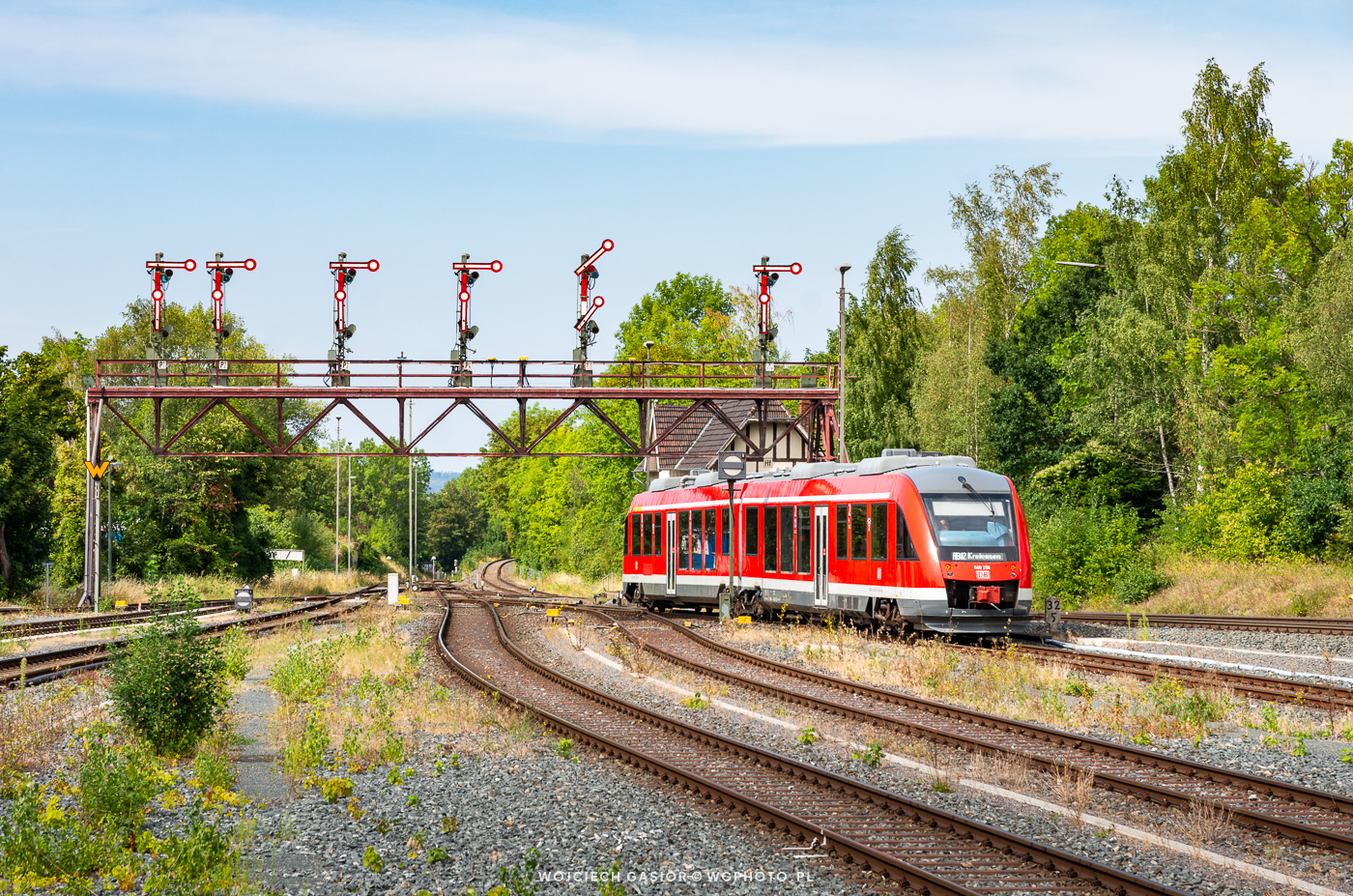 648.256 jako RB82 do Kreiensen odjeżdża z Bad Harzburg, mijając charakterystyczną bramkę sygnałową, która dziś jest już nieczynna, ale podobnież została zachowana w formie „martwej natury”. 19.08.2022