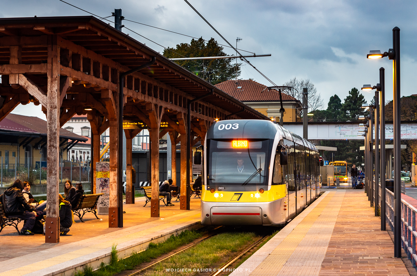 Bergamo, przystanek Bergamo FS. Tramwaje w Bergamo uruchomiono w obecnej formie w 2009 roku. Jedyna linia łączy po śladzie dawnej kolei centrum miasta, rozumiane jako okolice dworca kolejowego, z północno – zachodnimi przedmieściami. Tak poprowadzony tramwaj z pewnością jest szybki, ale też nudny, bo zupełnie pozbawiony „tramwajowych” odcinków na ulicach. Jak widać, nawet na plac przed dworcem ten tramwaj się nie wychyla, kończy natomiast bieg na czymś w rodzaju „małego dworca” (około 200 metrów od „dużego”), chociaż nie mam pojęcia, czy ma on cokolwiek wspólnego z koleją, która użyczyła swojego torowiska współczesnemu tramwajowi. 03.11.2014