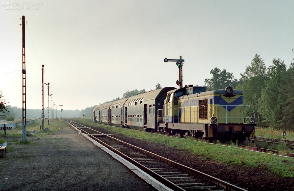 SU42-516 z pociągiem osobowym 17637 z Legnicy do Żar odbywa przedłużający się postój na stacji Leszno Górne w oczekiwaniu na nieplanowe krzyżowanie z opóźnionym „Bobrem” jadącym do Wrocławia. 01.08.2003