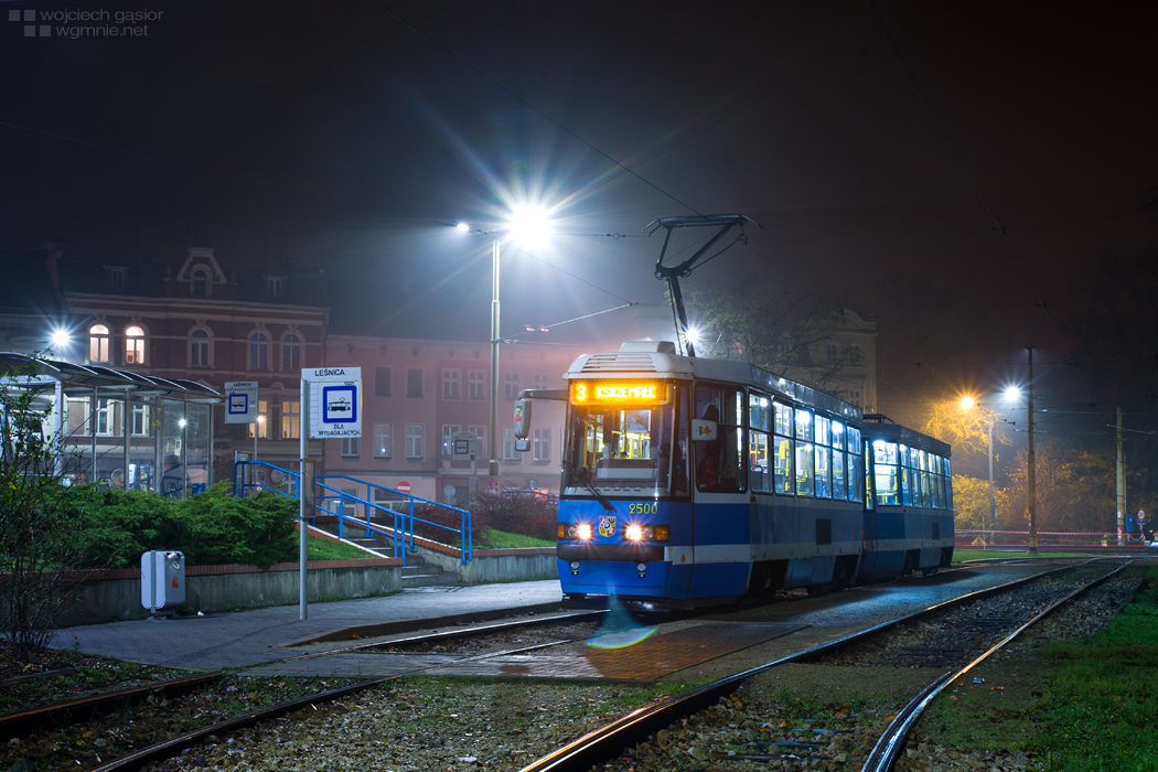 Wrocław, pętla Leśnica. Skład 105NWr 2500+2501 wykona wydłużony kurs linii 3, będący przejazdem z dychy na trójkę, dzięki któremu pełne liniowe kursy będzie mógł zakończyć wieczorem w „rejonie operacyjnym” macierzystej zajezdni (tj. na Księżu Małym), co pozwoli uniknąć kursu zjazdowego przez pół miasta. 21.11.2014