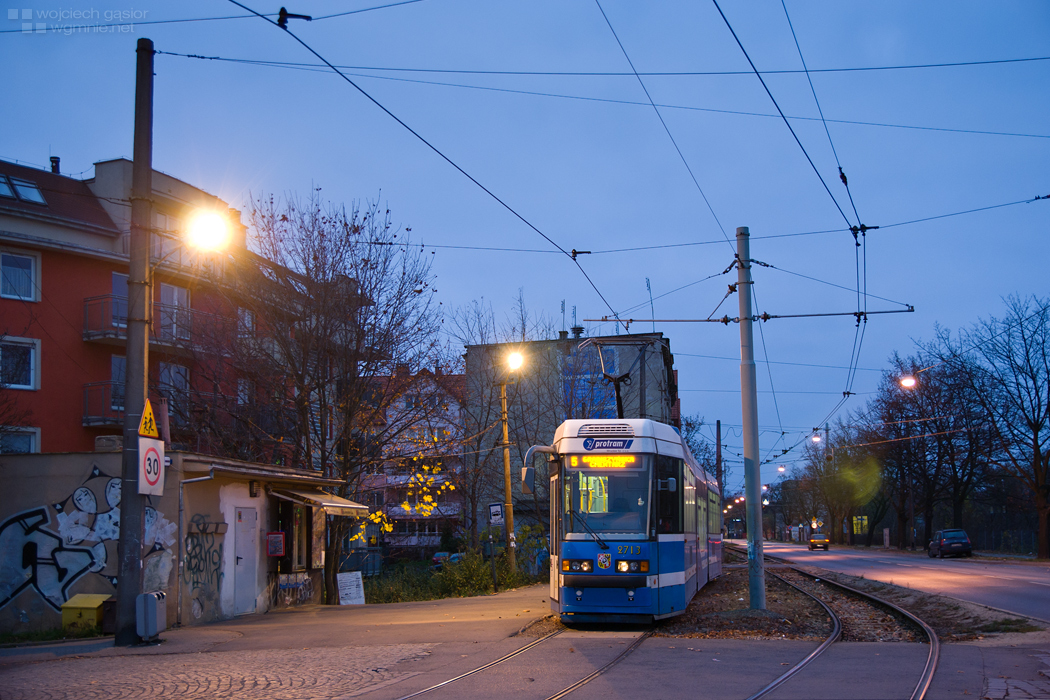 Pętla Księże Małe. Protram obsługujący linię 5 pozuje o poranku do zdjęć na przystanku dla wysiadających w tym zapomnianym nieco, zarówno przez władze miasta, jak i fotografujących, rejonie Wrocławia. Podwójny przewód nad prawym torem stanowi odcinek wstępny sygnalizacji zabezpieczającej jednotorowy odcinek na ul. Opolskiej. 11.11.2011