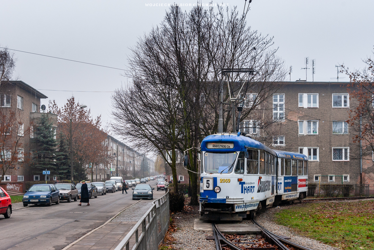 Wrocław, pętla Księże Małe. Z lewej strony widoczna jest ulica Katowicka wraz ze swoją charakterystyczną zabudową, po prawej zaś stodwójka, która – sądząc po tej teczce za szybą – musiała tego dnia pełnić rolę awaryjnego. 04.12.2009