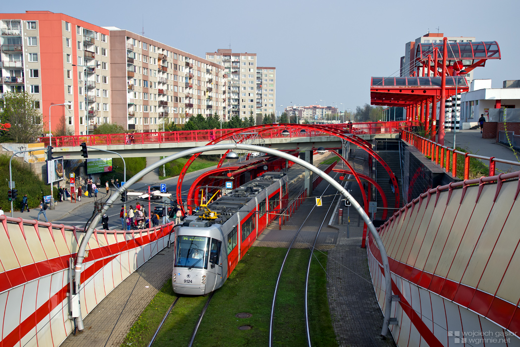 Praga, przystanek Chaplinovo náměstí. Peron opuszcza przedstawiciel wycofanej obecnie z ruchu serii 14T (opis z 2014). Pomiędzy Gelogicką a placem Chaplina znajduje się jeszcze przystanek K Barrandovu w barwach niebieskich, lecz ze względu na konieczność użycia drabiny do uzyskania sensownego ujęcia (znad barierek), obrazka nie będzie. 01.04.2014