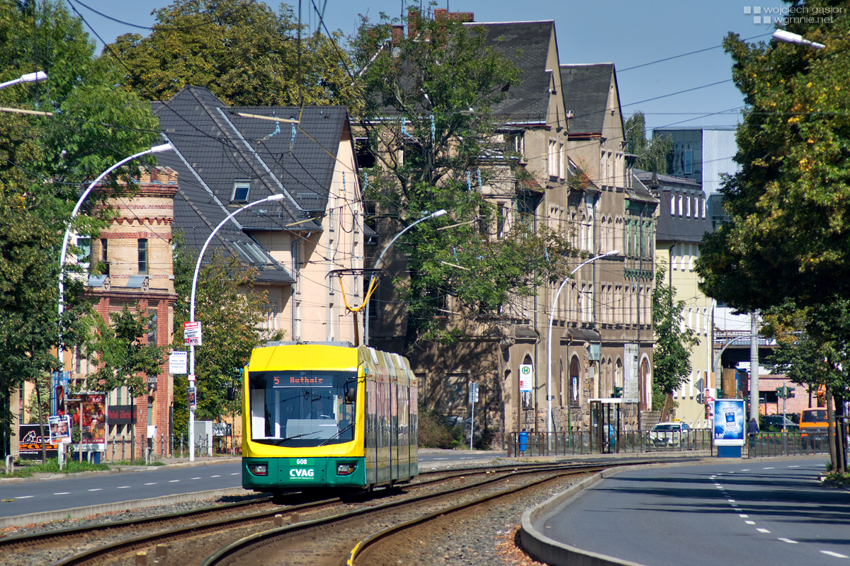Chemnitz, Annaberger Straße. 6NGT LDE 608 w drodze na Hutholz. Wbrew dość pokracznemu wyglądowi, wagony te, dzięki bardzo przestronnemu (to zasługa szerokości 2,65 m), dobrze rozplanowanemu i w pełni klimatyzowanemu wnętrzu oraz zastosowaniu sprawdzonych i niezawodnych rozwiązań, jak choćby drzwi wykładane zamiast sprawiających czasem problemy odskokowo-przesuwnych, mogłyby imho być wzorem funkcjonalności. 2009-09-08