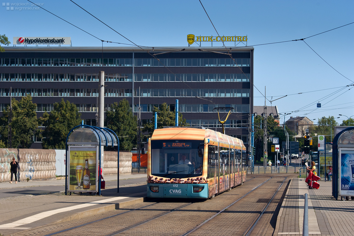 Chemnitz, Bahnhofstraße, przystanek Brückenstraße. Co bardziej spostrzegawczy obserwatorzy być może już zauważyli, że praktycznie co przystanek to inny model wiaty. A w tle widoczna jest wspaniała zabudowa tutejszego centrum. 2009-09-08