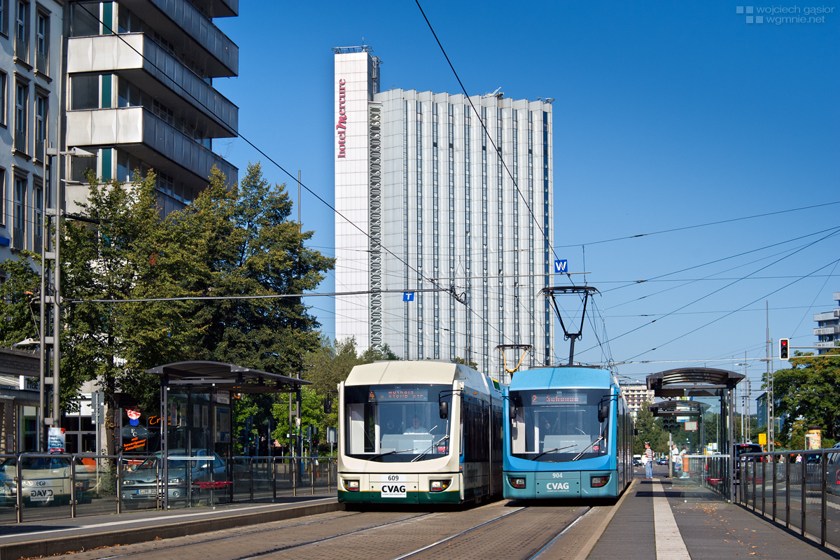 Chemnitz, Brückenstraße. Na przystanku Straße der Nationen mijają się dwa Variobahny: jednokierunkowy 609 i dwukierunkowy 904. Miejski przewoźnik posiada 24 wagony z tej rodziny: 14 jedno- i 10 dwukierunkowych, natomiast podmiejski – spółka City-Bahn Chemnitz GmbH – dodatkowo 6 dwukierunkowych. Chemnitz jest pierwszym miastem, do którego trafiły takie pojazdy. Prototyp (601) wyprodukowano w 1993 roku. 2009-09-08