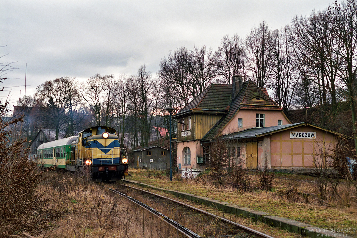 SU42-537 z poc. 22433 rel. Jelenia Góra – Bolesławiec zatrzymuje się na p.o. w Marczowie, gdzie wszystko wychyla się zza krzaków – i budynek, i pociąg. 09.12.2007