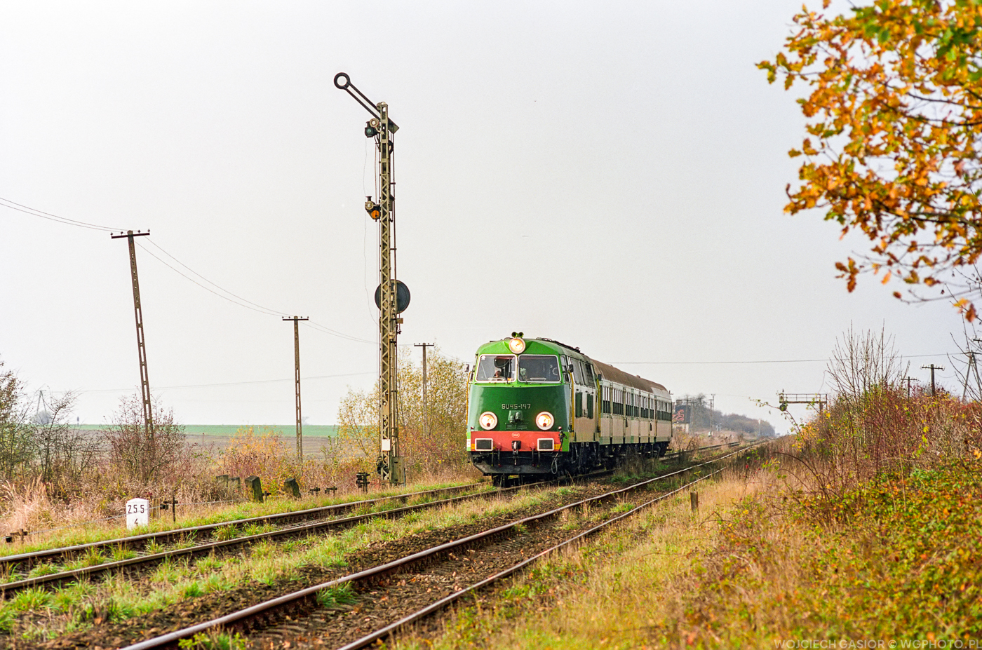 Błyszcząca SU45-147 prowadząc pociąg 67332 z Głogowa do Leszna mija semafor wjazdowy do stacji Wschowa. 02.11.2004