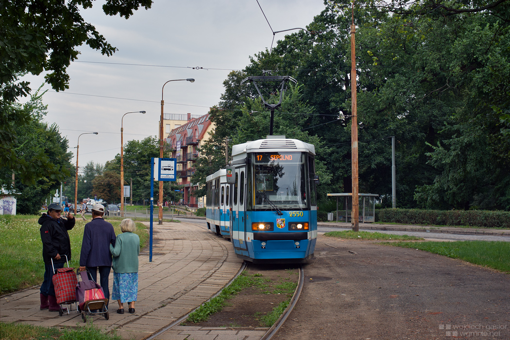 Wrocław, pętla Klecina przed przebudową. Na pierwszym planie wymiana uprzejmości, zapewne w drodze z lub na pobliskie ogródki działkowe, w tle zaś zestaw 105NWr 2550+2551, który bardzo chciał zrobić zjazd awaryjny, ale byłem twardy i udało mi się wykonać planowy zjazd do zajezdni z pasażerami (przez Hallera i Grabiszyńską) z zatrzymywaniem jedynie na przystankach. Awaria polegała bowiem na samoczynnym otwieraniu drzwi po każdym załączeniu hamulca postojowego. 09.08.2013