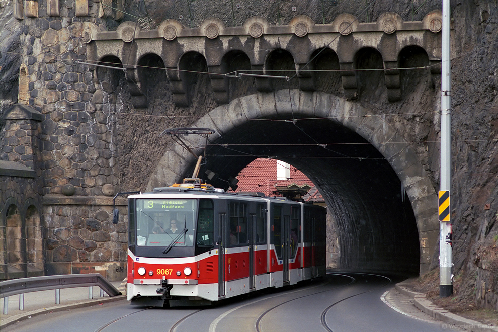 Praga, Podolské nábřeží. Wóz KT8D5.RN2P 9067 (czyli KT8D5 9017 po modernizacji) wyjeżdża z tunelu pod Wyszehradem. 15.02.2009