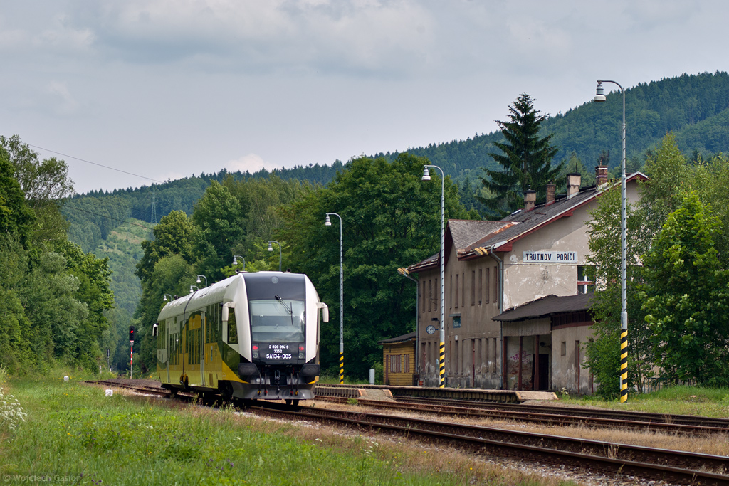 Pociąg osobowy 25402 relacji Trutnov hl.n. – Jelenia Góra, obsługiwany na terenie Czech przez spółkę GW Train Regio (dawny Viamont), zatrzymuje się przy peronie sterowanej zdalnie węzłowej stacji Trutnov-Poříčí, na której zmieni kierunek jazdy. Na chwilę przed przyjazdem pociągu przestrzeń tej pustej, położonej na uboczu stacji wypełniła odbijana echem od okolicznych pagórków zapowiedź głosowa, wypowiedziana w dwóch językach (czeskim i angielskim), z wypunktowaniem wszystkich przystanków aż do samej Jeleniej Góry. Podziwiam chęć łamania sobie języka na takich nazwach jak Sędzisław czy Trzcińsko. Co zaś się kadru tyczy, polowałem tu na polski szynobus już w zeszłym roku, lecz przez cały sezon na odcinku od Trutnova do Lubawki (później – aż do Sędzisławia) kursowała zastępcza komunikacja autobusowa. W roku 2013 patologia ta została zażegnana, lecz w zamian zerwano wieczorne skomunikowanie do Wrocławia w Sędzisławiu… 29.06.2013