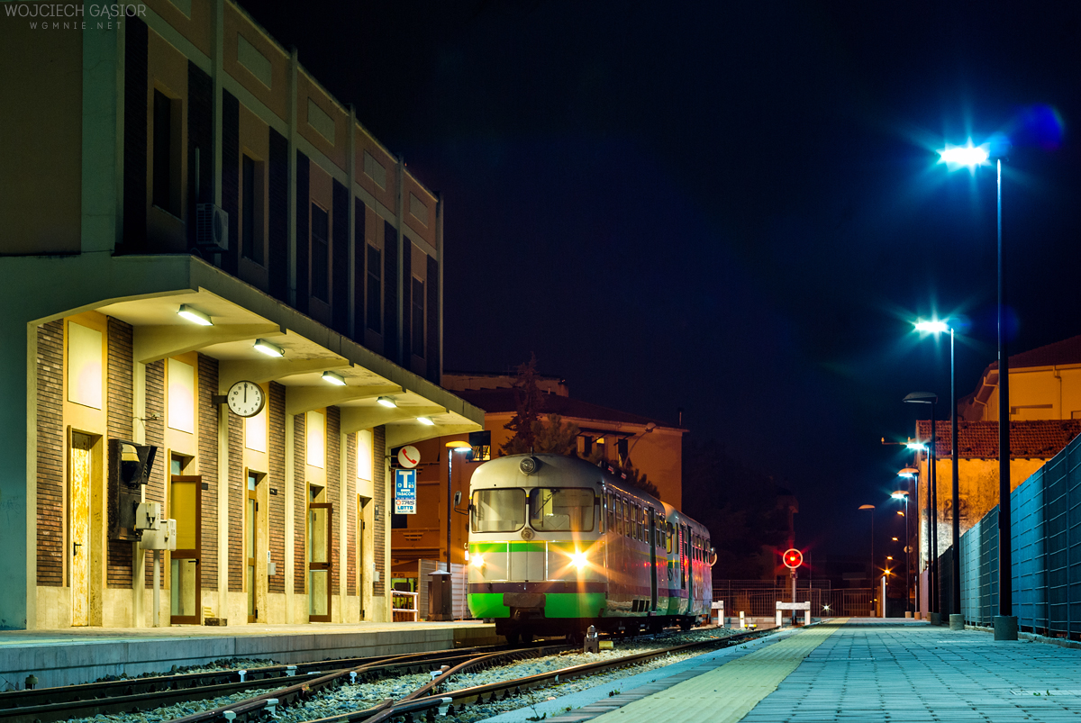 Niewielka stacyjka w Alghero, gdzie dociera wąskotorowa linia z Sassari, stanowi jeden z „kolejowych końców świata” na Sardynii. Pociąg nr 80 do Sassari za chwilę odjedzie ze stacji początkowej. 2012-03-23