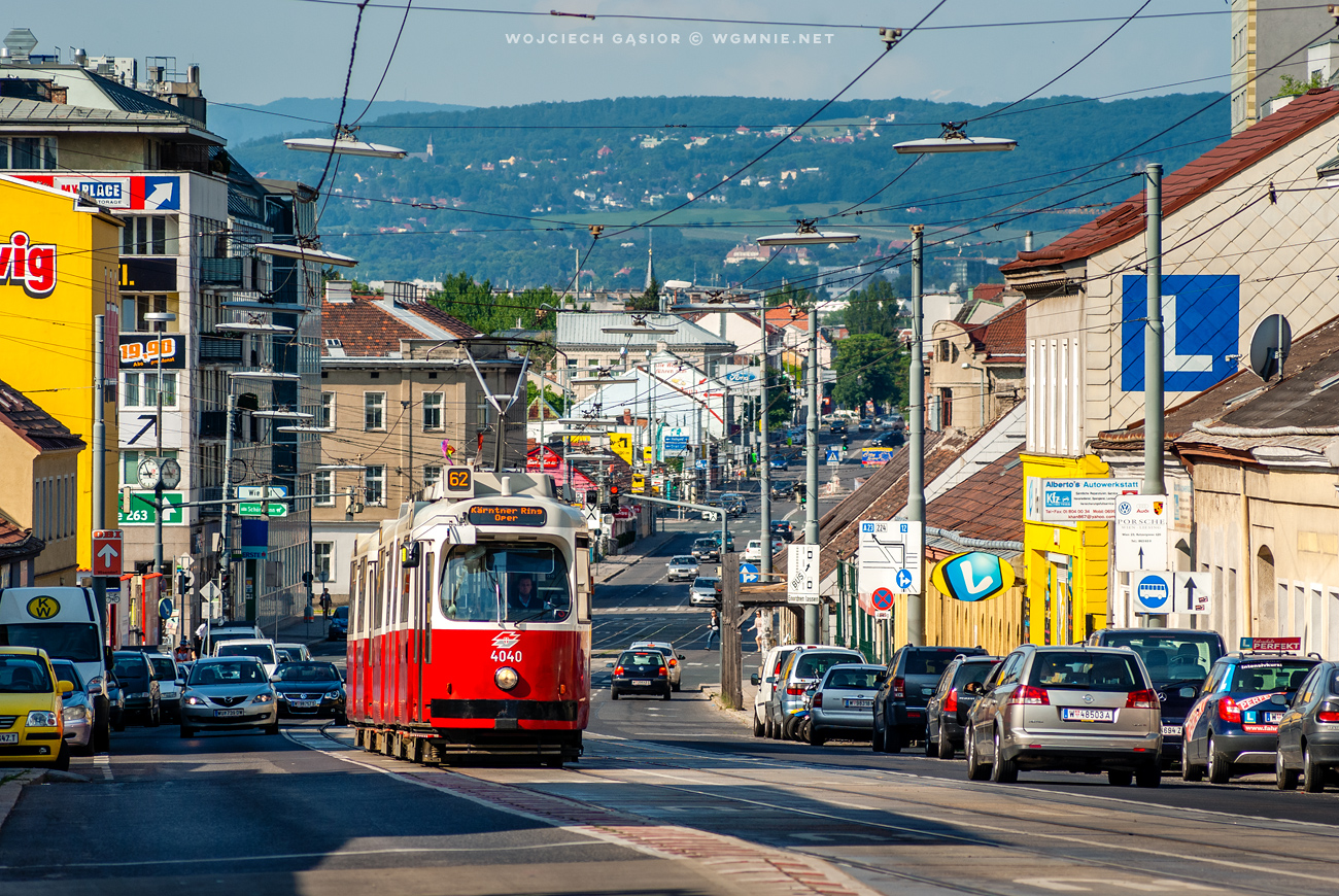 Tytułowy skład obsługując jedną z dłuższych wiedeńskich linii tramwajowych (aż 45 minut „przelotu”, podczas gdy średnia nie przekracza chyba minut trzydziestu) wspina się Breitenfurter Straße w kierunku centrum miasta. Chcąc fotografować krajobrazy w słońcu należy konkretne miejsca odwiedzać o odpowiednich porach dnia, co raczej nie ułatwia zadania. Upatrzony wcześniej kadr nierzadko jest bowiem korzystniej „zdjąć” o innej porze niż owo upatrzenie nastąpiło, trzeba się więc pofatygować w teren po raz drugi. Ten akurat motyw działa tylko z rana. 2012-05-27