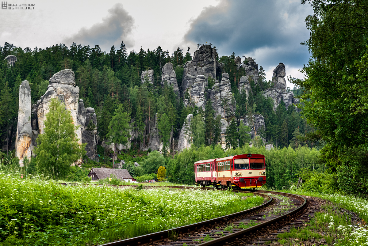 810 655-1 z doczepą jako poc. 15759 rel. Trutnov hl.n. – Teplice nad Metují zbliża się do Adršpachu. Linia kolejowa z Trutnova do Teplic okrąża skalne miasto na kilkunastokilometrowym odcinku, ale tylko w tym miejscu można sfotografować pociąg na tle popularnych piaskowców. 2012-06-10