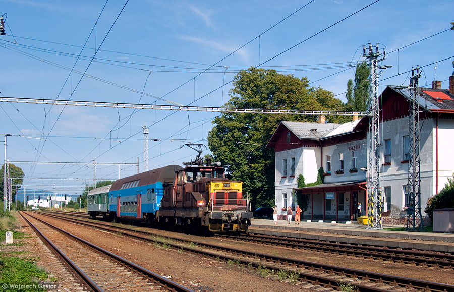 210 037-8 z przyspieszonym pociągiem 1937 „Vltavský vodák” relacji České Budějovice – Rybník mija bez zatrzymania stację Velešín. Województwo Południowoczeskie było wówczas jednym z trzech miejsc w Czechach (obok linii Ústí nad Orlicí – Lichkov oraz Tábor – Bechyně), gdzie zatrudniano żelazka w ruchu pasażerskim – warto dodać, że w każdej lokalizacji były to maszyny na inny system zasilania (odpowiednio 25 kV AC, 3 kV DC i 1,5 kV DC). Obecnie (opis z 2012) z taką obsługą można się spotkać tylko w rejonie Českých Budějovic. 2010-08-23