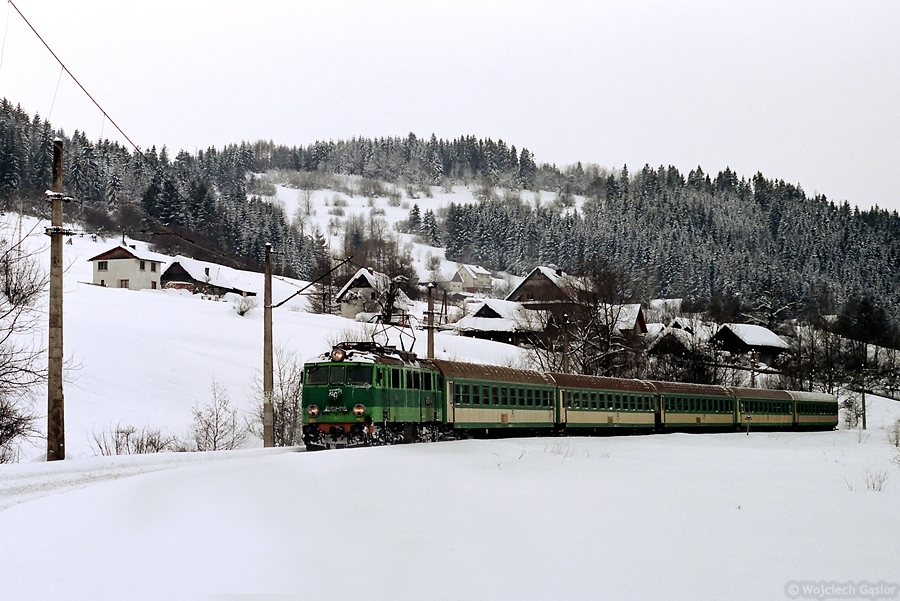 Odcinek Sól – Rycerka. EU07-216 prowadzi pociąg osobowy 718 ze Zwardonia do Katowic. 31.12.2005