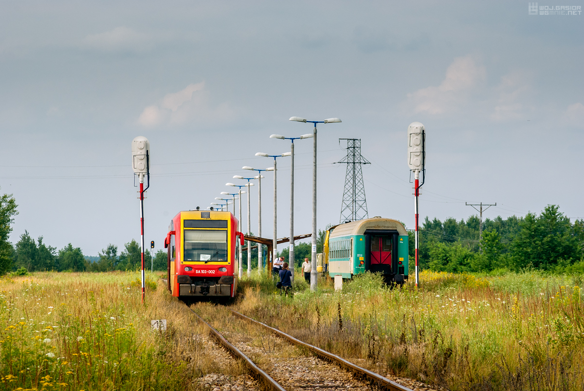 Coś mi się nie zgadza ten obrazek z rozkładem jazdy, ale możliwe że na dalszym odcinku do Tarnobrzegu był KKZ. SA103-002 zaraz odjedzie do Rzeszowa, skąd przed chwilą przybył skład wagonowy. A to wszystko dzieje się na stacji Dęba Rozalin, położonej pośrodku niczego, gdzie gdyby nie obsługa pociągu i focista, na zarośniętym peronie (za to z nowymi latarniami) żywej duszy by nie było. 20.07.2010