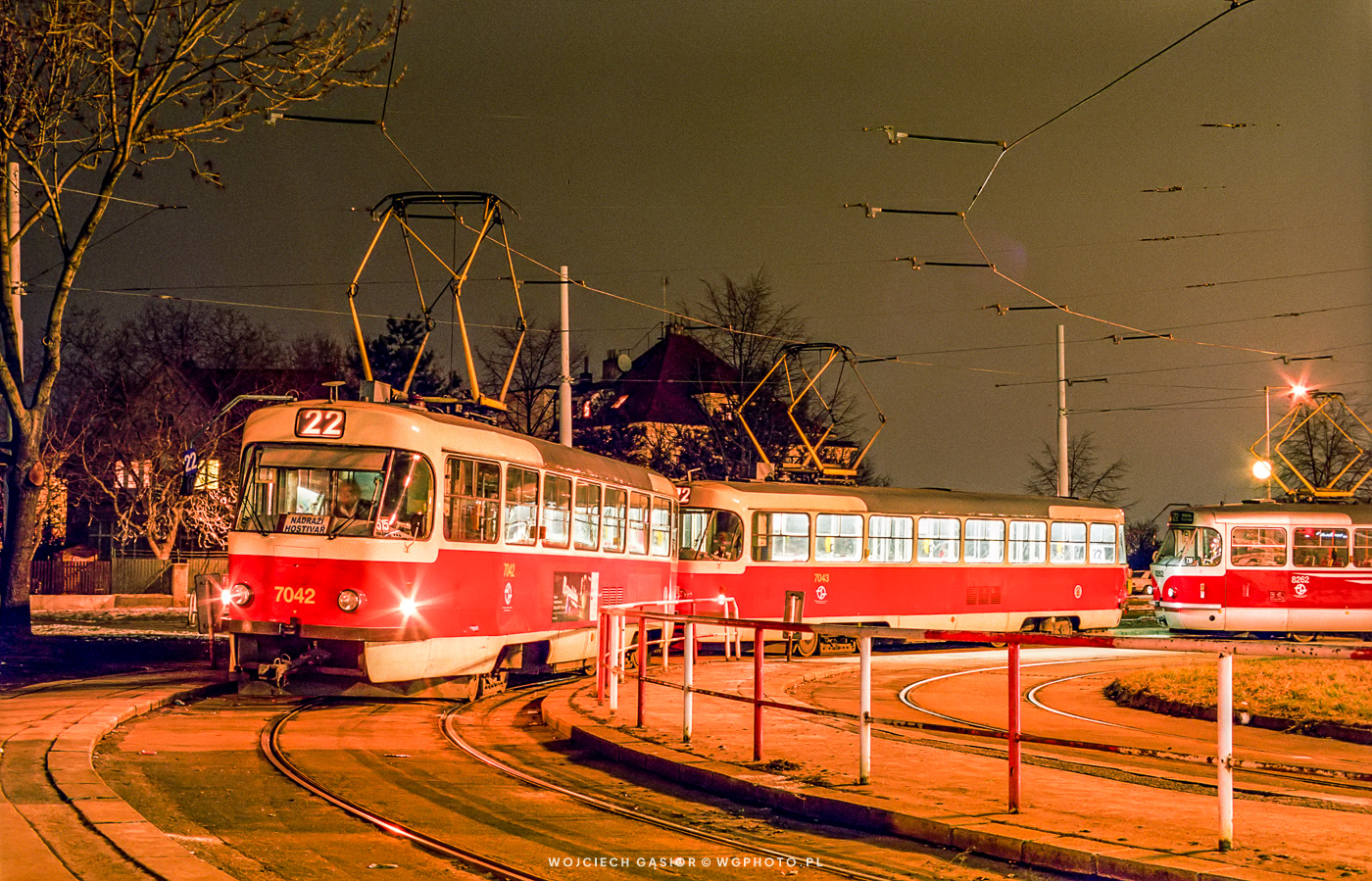Praga, pętla Bílá hora, skład T3SUCS 7042+7043. Pierwszy wagon w 2012 roku trafił do Charkowa, gdzie kursował przez kolejne 6 lat, zaś doczepę odstawiono już rok po wykonaniu zdjęcia i następnie trafiła jako „pomnik” na prywatnym terenie przy ul. Mladoboleslavskej, po przeciwległej stronie Pragi. 15.02.2009