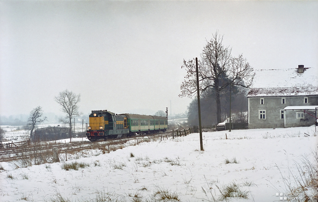 Pociąg osobowy 7733 z Lubawki do Wałbrzycha Gł. pokonuje dwutorowy szlak Kamienna Góra – Sędzisław. Za składem widać „zwieszony” semafor wjazdowy do zamkniętego 1,5 roku wcześniej Podg Krużyn. 27.12.2002