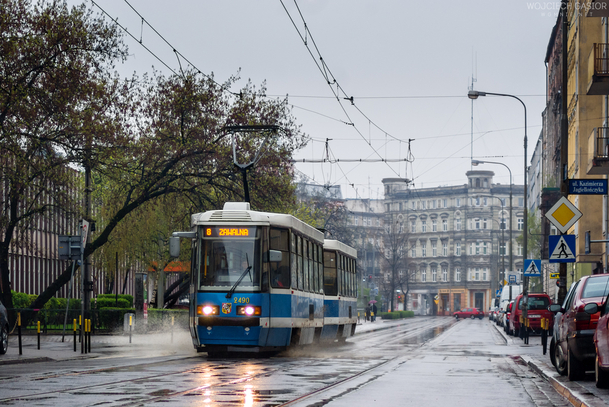 Zestaw 105NWr 2490+2491 w ponury, deszczowy dzień mija skrzyżowanie ul. Chrobrego z Jagiellończyka we Wrocławiu. 15.04.2012