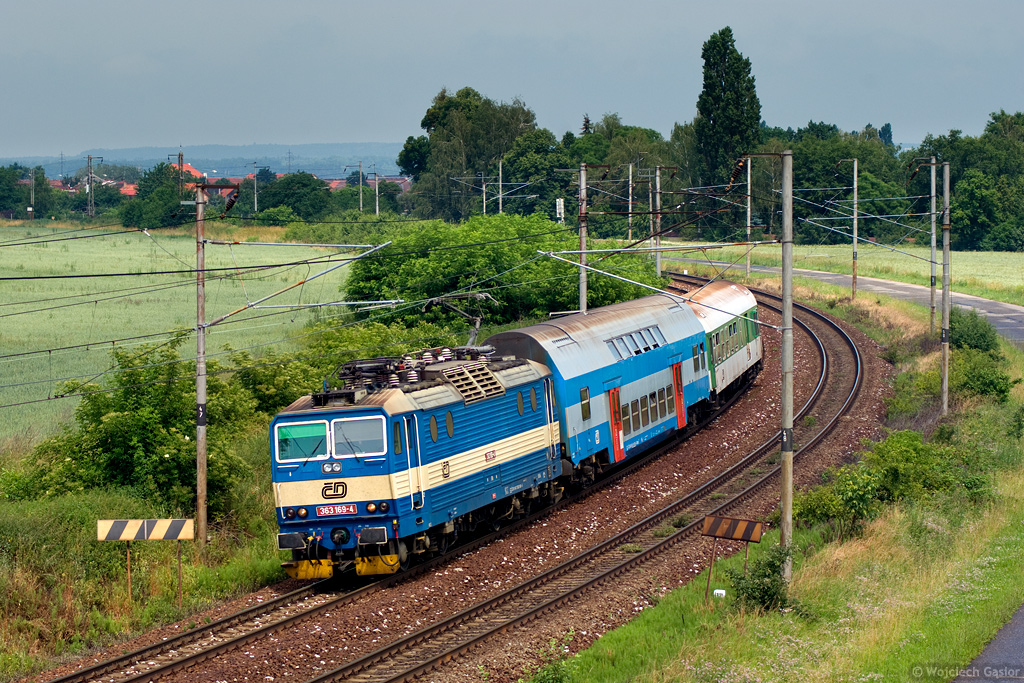 Odcinek Hlízov – Kutná Hora hl.n. Dwusystemowa maszyna 363 169-4 z poc. osob. 5907 rel. Kolín – Havlíčkův Brod ciągnie w tej chwili prąd = 3 kV; zmiana systemów zasilania następuje dokładnie w peronach stacji w Kutnej Horze. Obsługa trakcyjna granicznych odcinków obojga systemów zasilania sieci trakcyjnej z uwagi na deficyt lokomotyw dwusystemowych jest dosyć kłopotliwa. O ile pociągi dalekobieżne (pospieszne oraz kwalifikowane) są na ogół obsługiwane przez Asy (czes. Eso) w pełnej relacji, o tyle osobowe są zazwyczaj dzielone na krótkie relacje tak, by do obsługi odcinka stycznego wystarczył jeden obieg, a więc tylko jedna cenna maszyna dwusystemowa. Czasem mniej frekwencyjne kursy obsługiwane są motorakami, w ostateczności do akcji wkracza trakcja spalinowa, planowo zaprzęgana do pojedynczych pociągów jadących pod drutem. Licząca 74 km relacja Kolín – Havlíčkův Brod jest jedną z dłuższych osobowych, prowadzonych lokomotywami serii 363. 2012-06-20