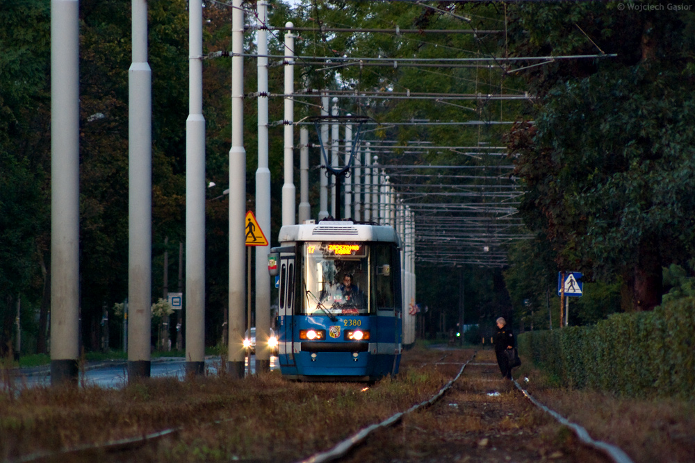 105NWr 2380+2379 wykonuje po popołudniowym szczycie zjazd do zajezdni Dąbie przez nie wykorzystywany przez regularne linie odcinek ulicy Mickiewicza. Na widocznym fragmencie z uwagi na stan toru obowiązuje ograniczenie prędkości do 10 km/h. Należy odnotować, że motorniczy tej prędkości nie przekroczył, ułatwiając mi wykonanie zdjęcia na ogniskowej 2×210 mm (zoom+konwerter; dla pełnej klatki to będzie coś koło 600 mm) w mocno już o tej porze niesprzyjających warunkach oświetleniowych. 06.09.2012