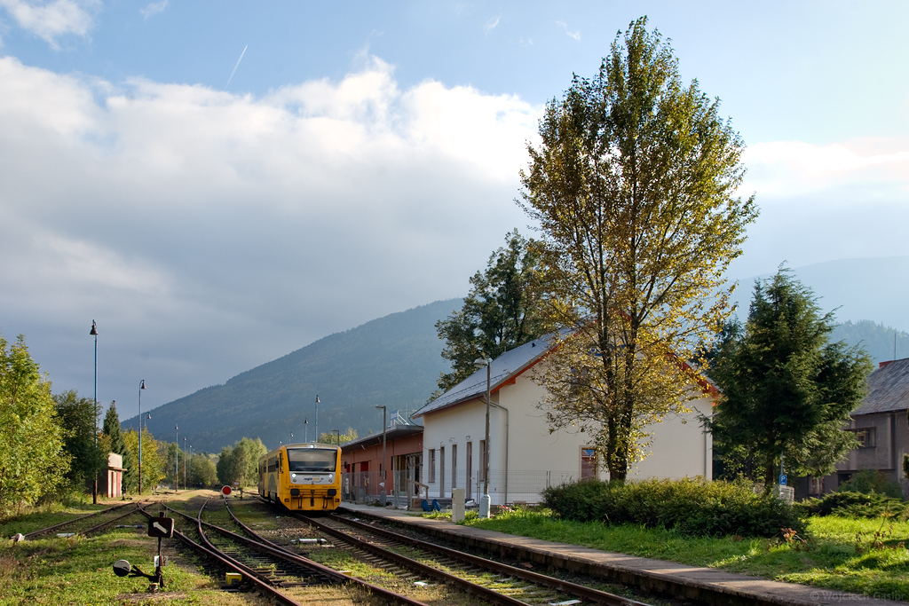 814.093 jako poc. 13127 do Frýdlantu nad Ostravicí oczekuje pory odjazdu z wioski położonej u stóp Morawskośląskich Beskidów. W mocno niesprzyjających warunkach terenowych, ze słońcem nie z tej strony co trzeba, budynkiem w remoncie i właśnie przyklejaną do niego nowoczesną przybudówką, wymyśliłem taki oto kadr, z którego jestem absolutnie zadowolony. 12.10.2012