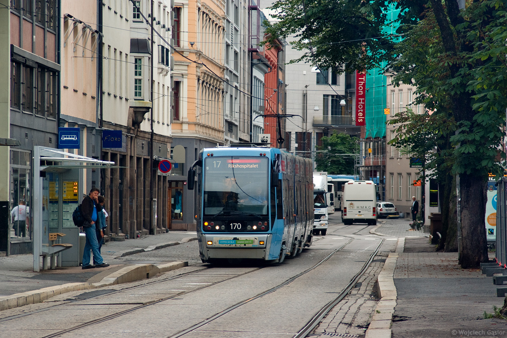 Oslo, Kristian Augusts gate. Niskopodłogowa siedemnastka za chwilę zatrzyma się na przystanku Tullinløkka. Niestety nie pomyślałem wtedy by sprawdzić, czy motorniczy celuje drzwiami wyposażonymi w platformę w punktowe podwyższenie peronu. 25.07.2011