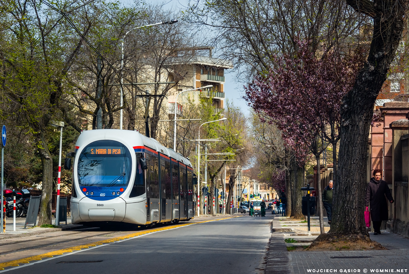 Sassari, Viale San Pietro. Wagon SS03 mija zespół szpitali klinicznych i zjeżdża na „dolny taras” miasta – w stronę dworca kolejowego. 2012-03-23