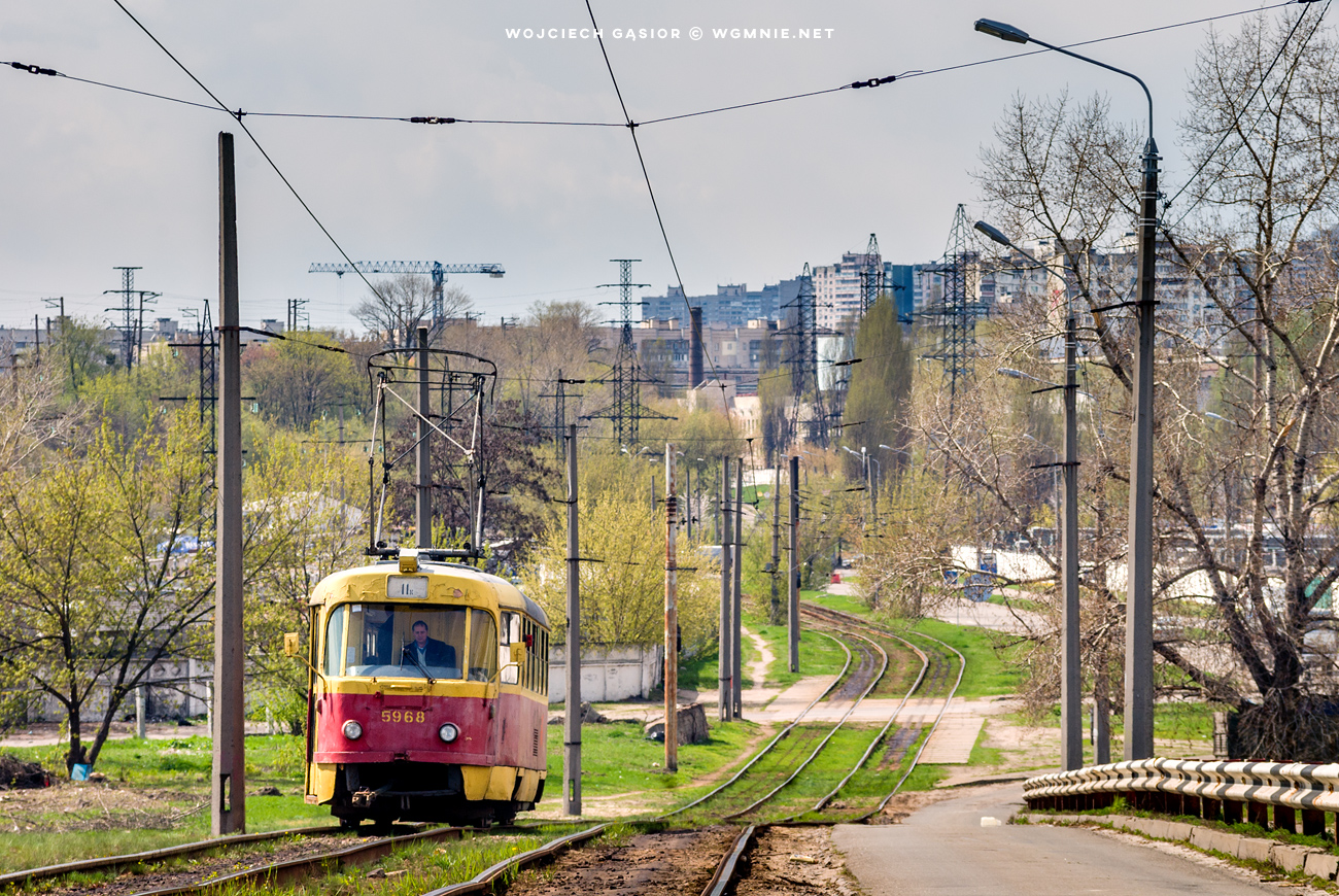 Kijów, ul. Dobrynynska. Jedna z niewielu kijowskich tatr typu T3, pochodzących z rocznika młodszego ode mnie, wspina się na wiadukt nad bocznicą kolejową. 2010-04-23