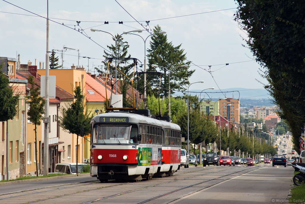 Brno, ul. Banskobystrická. Zestaw T3M 1568+1566 wspina się w kierunku Řečkovic. 21.07.2009