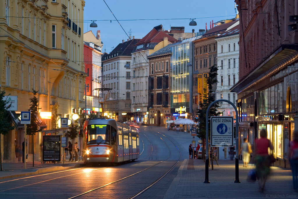 Brno, ul. Rašínova. Škoda 13T 1907 minąwszy Náměstí Svobody (coś jakby rynek) zatrzymała się na przystanku o takiejż nazwie. 21.07.2009