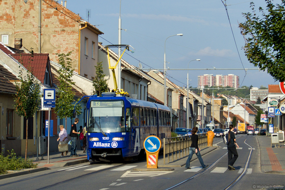 Brno, ul. Táborská. K2R 1030 obsługuje przystanek Buzkova (choć nazwa zgadzałaby się, nie chodzi najpewniej o pana Jerzego). Przysunięcie torów ku krawężnikom wraz z budową wyspy w osi jezdni kosztem zwężenia pasów ruchu na długości przystanku z pewnością przyczyniły się do zwiększenia bezpieczeństwa pieszych. Rozwiązanie takie zastosowano na trzech kolejnych przystankach trasy na Julianov. 12.09.2008