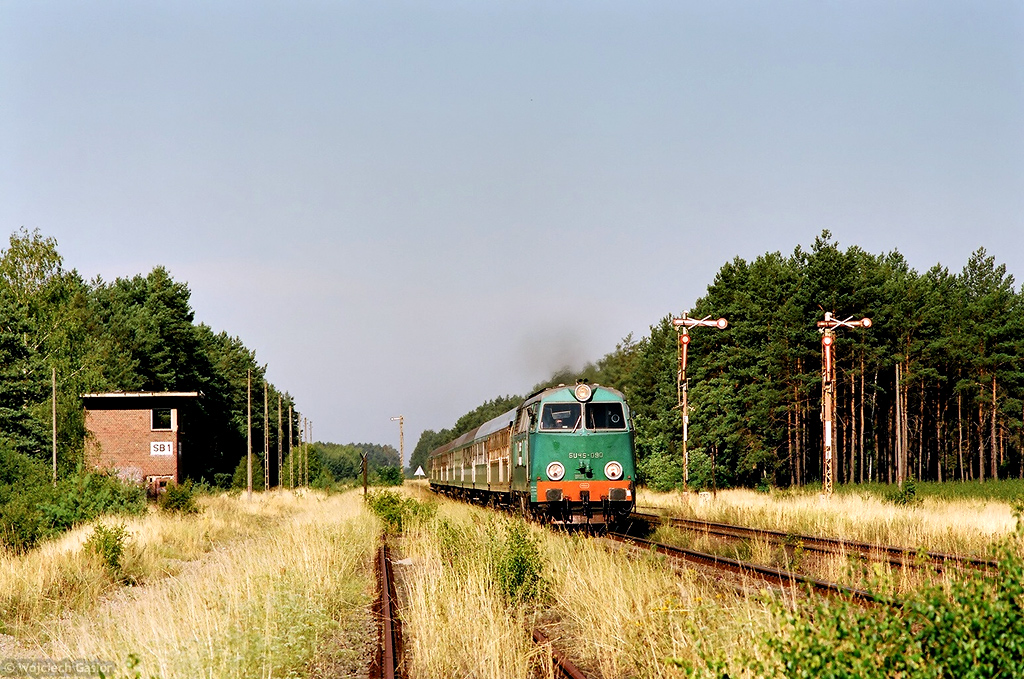 SU45-090 z poc. posp. 83106 „San” z Kostrzyna do Przemyśla i Zamościa mija niegdyś węzłową, obecnie zaś nieczynną stację w Starych Bielicach. 27.07.2006