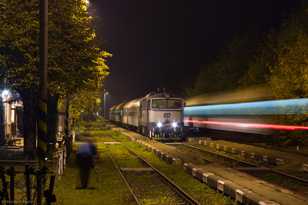 Potštejn. Dyżurny ruchu wyprawił na szlak do Doudleb n. Orl. rychlik 252 rel. Wrocław Gł. – Praha hl.n. (warto nadmienić, że wedle czeskich przepisów sygnał odjazdu ma formę krzyża), za chwilę na szlak w przeciwnym kierunku – do Litic n. Orl. – wyjedzie pociąg z Pragi do Wrocławia. Na najlepsze ujęcie z krzyżowania jakiś taki mi się tutaj wtrynił… 2009-10-25