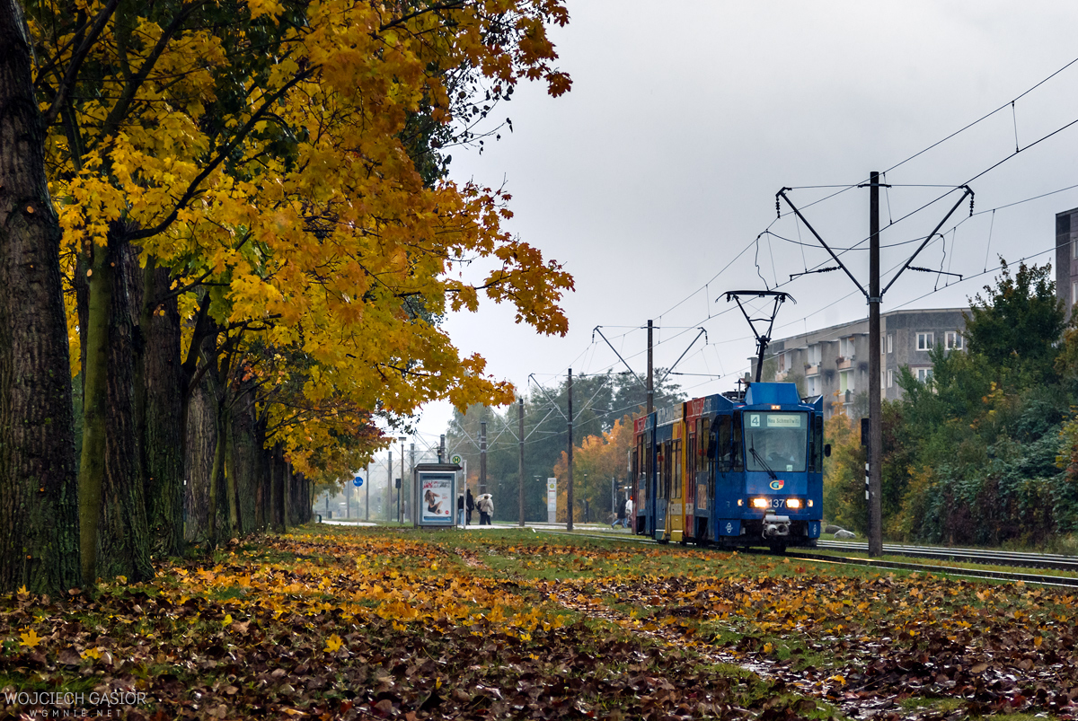Wagon KTNF6 137, powyginany jak większość katówek z niską wstawką, odjechał z przystanku Neue Straße. Jeszcze tylko przystanek Zuschka i za chwilę dotrze do położonej wśród enerdowskiej wielkiej płyty pętli Neu Schmellwitz, której dolnołużycką nazwę zawarłem w tytule. 20.10.2010