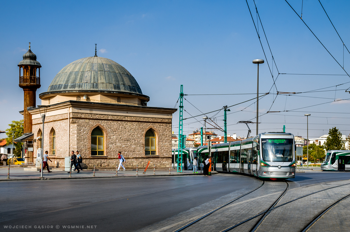 Konya, Alaaddin Bulvarı. Škoda kończy kurs z uniwersytetu na śródmiejskiej pętli, mijając meczet Şazibey Camii. 07.10.2016