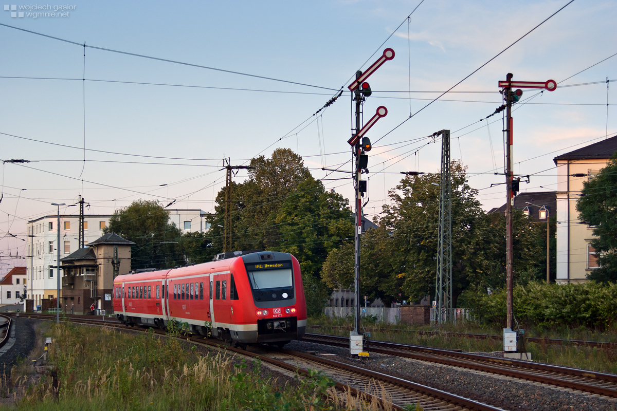 Dwa semafory na stacji Zwickau (Sachs) Hauptbahnhof, wyjazd w kierunku Chemnitz. Zachciało mi się je sfotografować z jakimś pociągiem, dlatego wyjechałem stąd pół godziny później niż mógłbym. W rezultacie nie zdążyłem na przesiadkę na ostatni pociąg do czeskiego „domu” – chociaż według rozkładu jazdy miałem 20 minut zapasu – i 30 km z Marktredwitz do Chebu musiałem pokonać pieszo. 08.09.2009