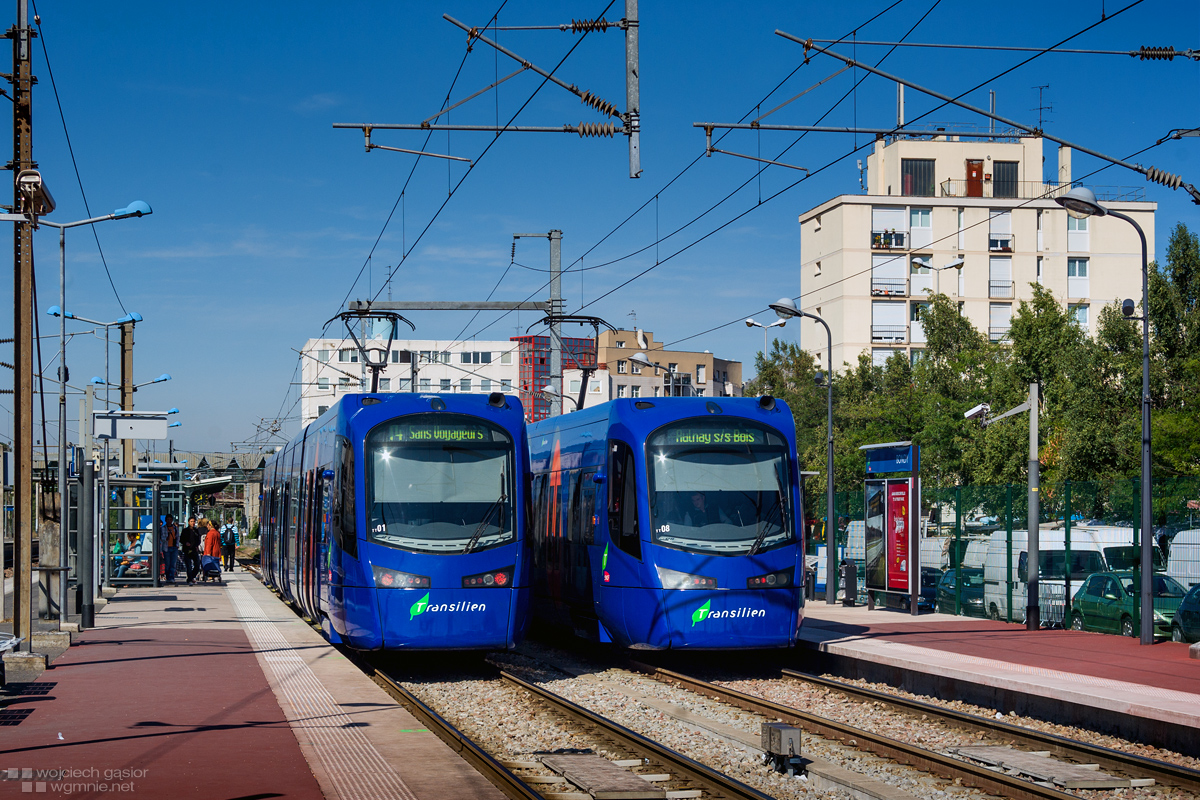 Bondy (aglomeracja paryska). Pozostając w temacie pojazdów w kolorze granatowym przenosimy się pod Paryż, gdzie od 10 lat kursuje sobie linia tramwajowa T4, obsługiwana przez Transilien – spółkę córkę SNCF odpowiedzialną za ruch podmiejski. Trasa, poprowadzona w całości po śladzie dawnej linii kolejowej, liczy niespełna 8 km oraz ma oba końce na stacjach stycznych z koleją podmiejską, na których tramwaj wjeżdża wprost w perony – przy lewej krawędzi lewego peronu zatrzymuje się już „prawdziwy” pociąg. 01.09.2010
