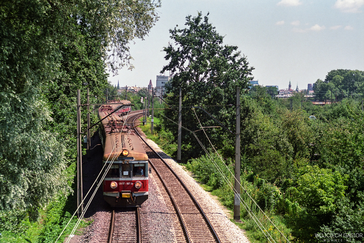 Zestaw EN57-907+905+910 obsługujący pociąg dodatkowy Wrocław Gł. – Kostrzyn złapałem zupełnie bez sensu, bo o tym, że to potrójniak, można się zorientować tylko licząc pantografy. No ale w takim kadrze widać wieżę ratusza i zapewne tym się kierowałem. 😉 2008-07-31