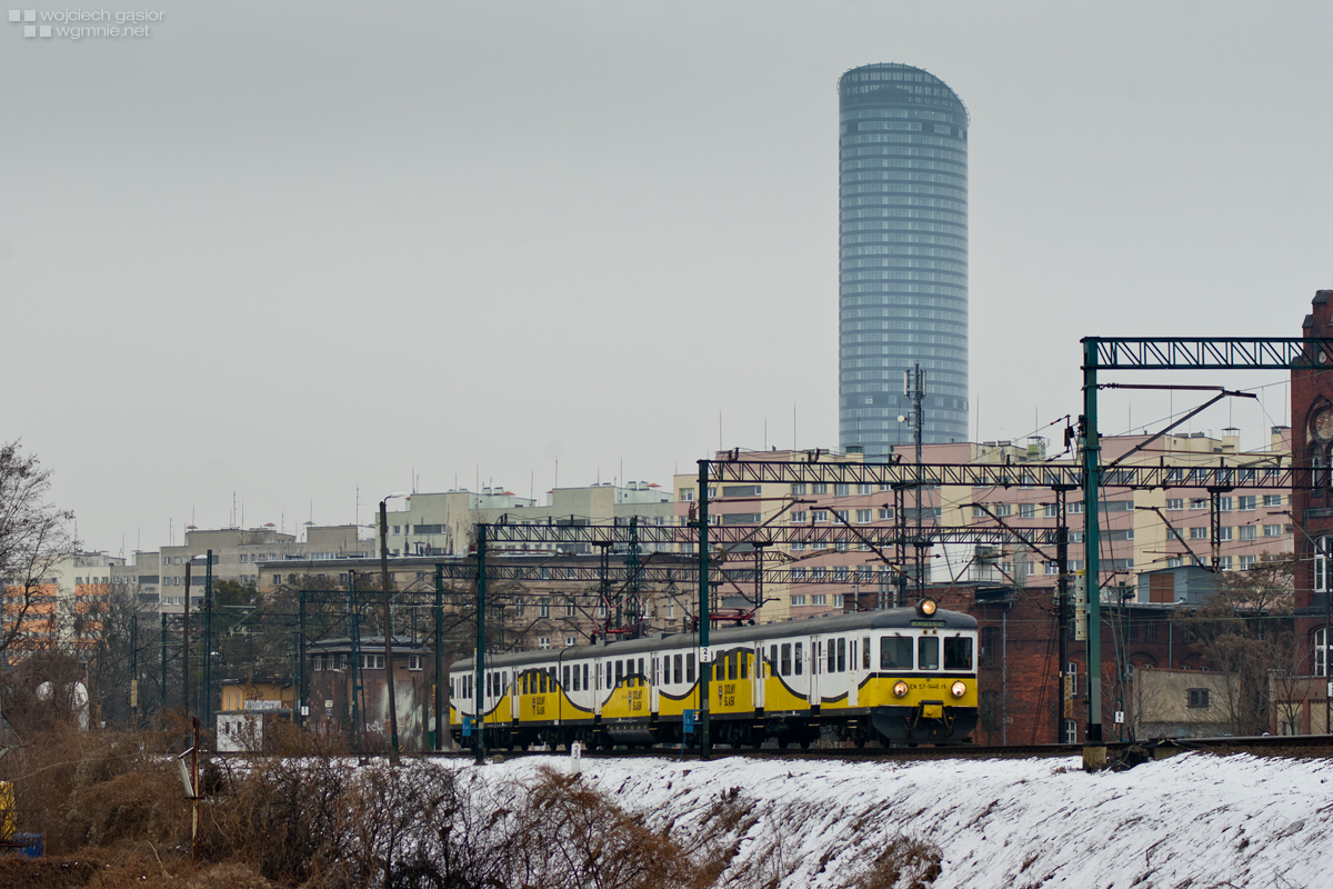 EN57-1446 jako osobowy do Rawicza mija Podg Grabiszyn, a sytuacji tej znad 10-piętrowych bloków przygląda się budynek tyleż wysokich co kontrowersyjnych kształtów. 05.04.2013