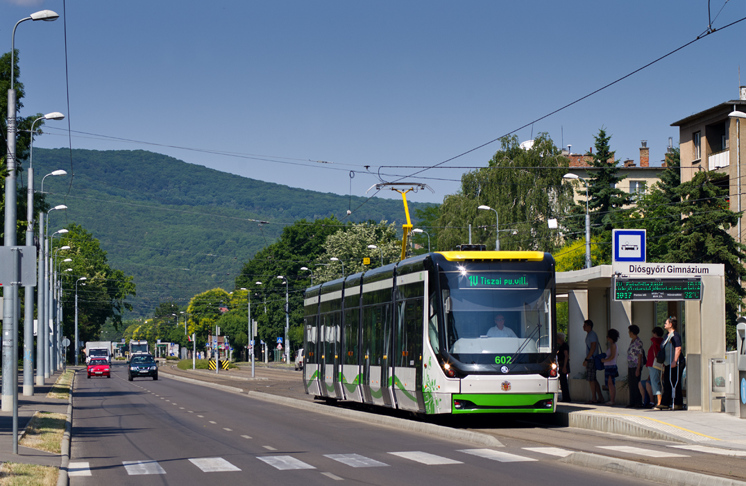Miskolc, Kiss Tábornok utca. Új Škoda zatrzymuje się na wyspowym przystanku i celem dokonania wymiany pasażerskiej otworzy drzwi z lewej strony – wykona zatem to, czego wrocławskie dwukierunkowe Škody nie potrafią. 19.06.2014