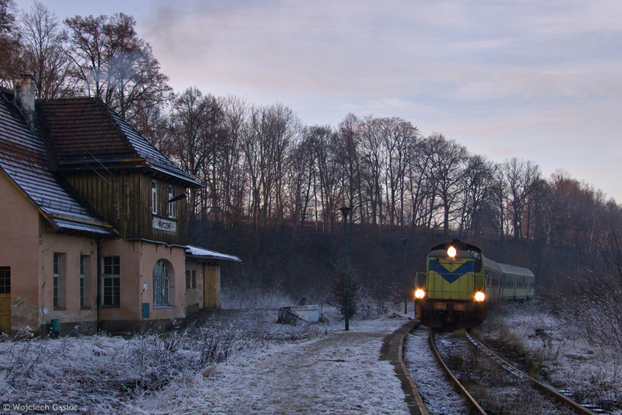 Pociąg osobowy 22446 z Bolesławca do Jeleniej Góry zatrzymuje się w Marczowie. Krótki, zimowy dzień dobiega końca, pora więc wracać do domu. 23.12.2007
