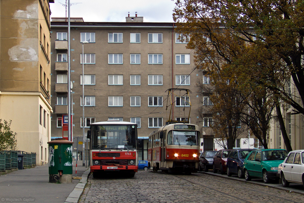 Praga, ul. Vodárenská. Tramwaj okresowej linii 21, kursującej w relacji Podolská vodárna – Sídliště Modřany w związku z vyluką w Wyszehradzkim Tunelu, objeżdża pętlę w formie kryterium ulicznego, mijając jakąś karosę. Na pętli tej można się było przesiąść na dwie linie komunikacji zastępczej: autobusową oraz… promową (omijającą tunel Wełtawą, płynącą tuż obok zamkniętej ulicy). 10.11.2008