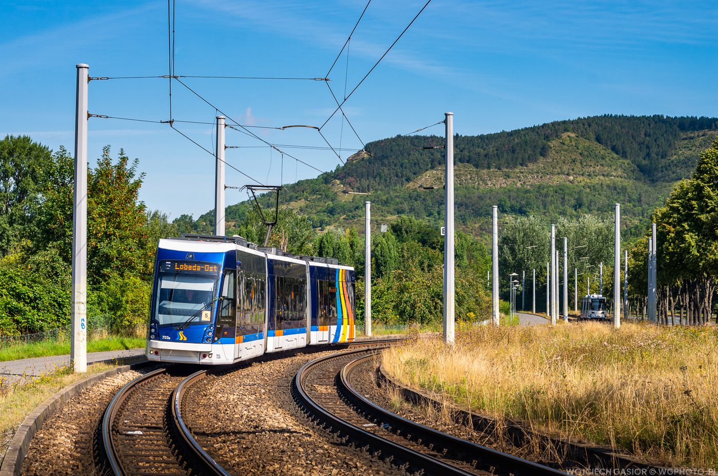 Jena jest bardzo ładnie położona wzdłuż Soławy oraz pomiędzy pagórkami, co determinuje układ sieci tramwajowej rozciągnięty w osi północ-południe. Istnieje kilka stosunkowo długich odcinków między sąsiednimi osiedlami, które zdecydowanie nie zdradzają sąsiedztwa cywilizacji. W takich okolicznościach przyrody oprócz 33 niskaczy niemieckiej produkcji, od 2013 roku kursuje 5 Solarisów Tramino. Niemcy kupili te pojazdy w ciemno, były to bowiem pierwsze egzemplarze z tej udanej imho rodziny tramwajów. 2016-08-16